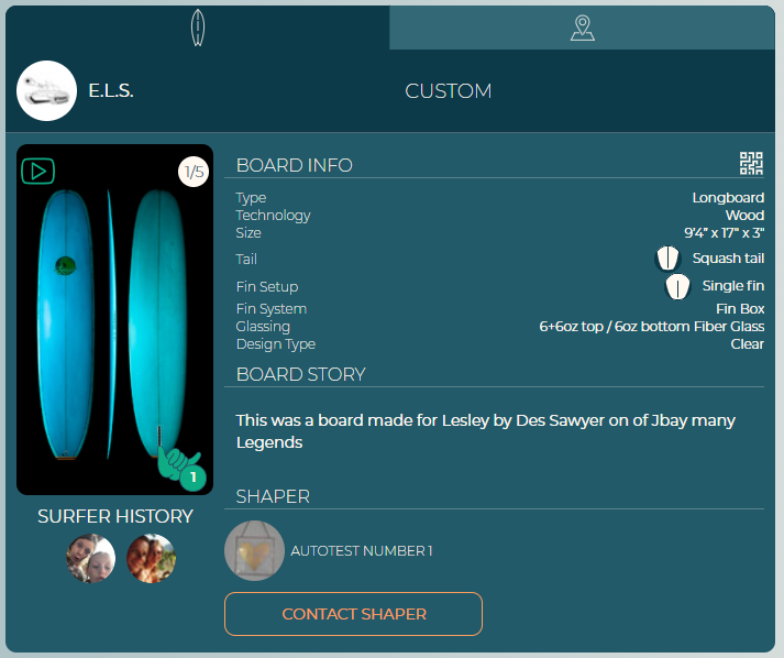 Tab 1: Full details, Model story, board story, shaper and surfer history